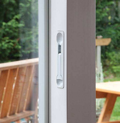 Available exclusively on V400 Tuscany Series sliding doors, the SmartTouch® Bolt is a fully integrated steel bolt that secures the sliding patio door firmly into the top frame with the flip of a lever. As an added benefit, SmartTouch Bolt can let the fresh air in while keeping the door secure in a vented position.